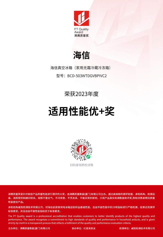 海信真空冰箱荣获2023年度适用性能优+奖