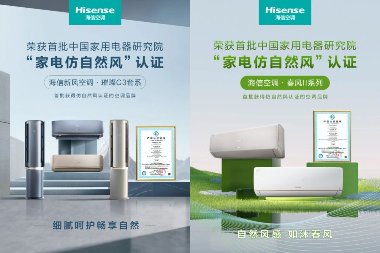 海信空调获“家用电器仿自然风”认证证书